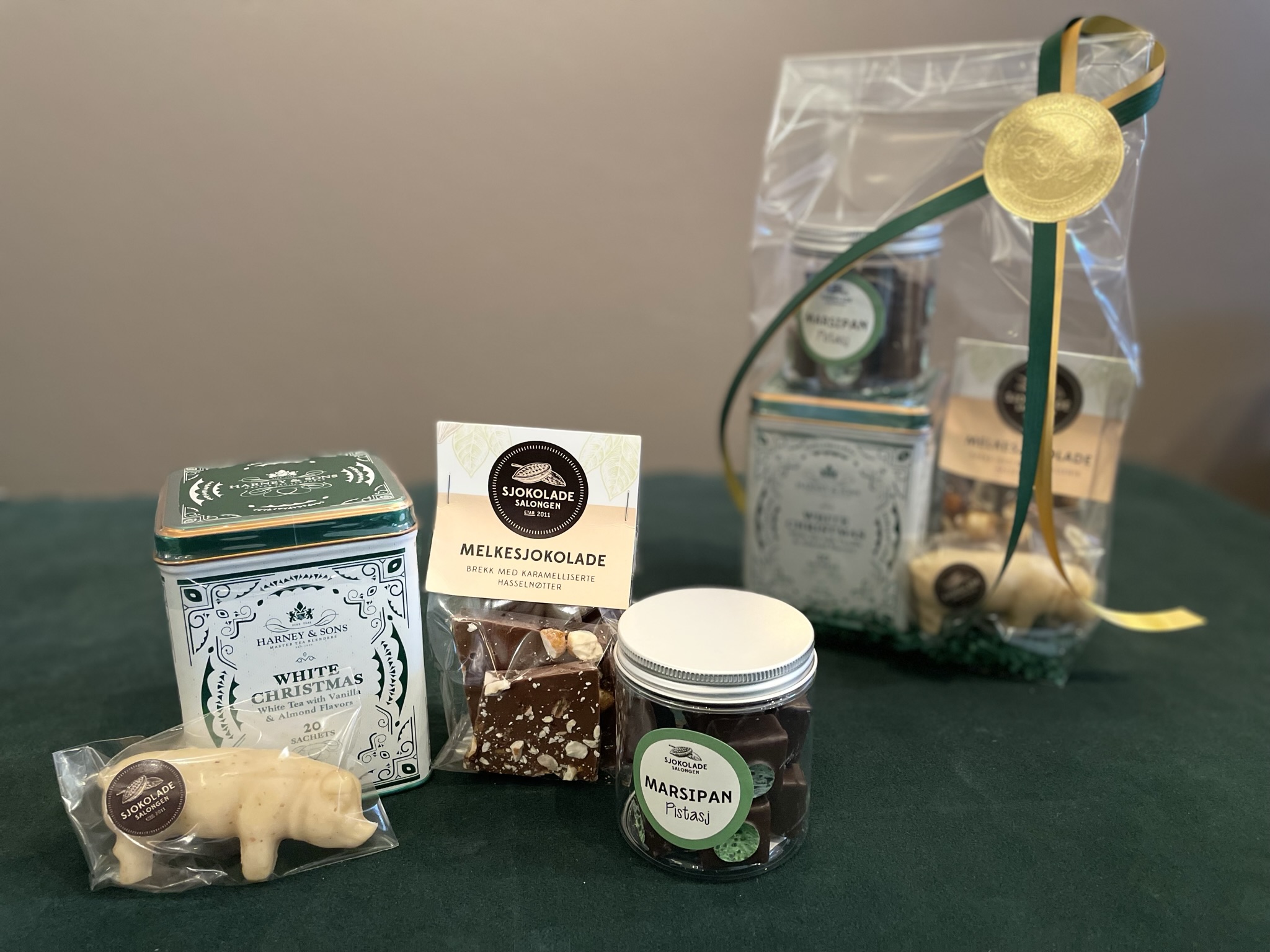 Vi har laget ulike gavepakninger med våre sjokolade- og marsipanprodukter.