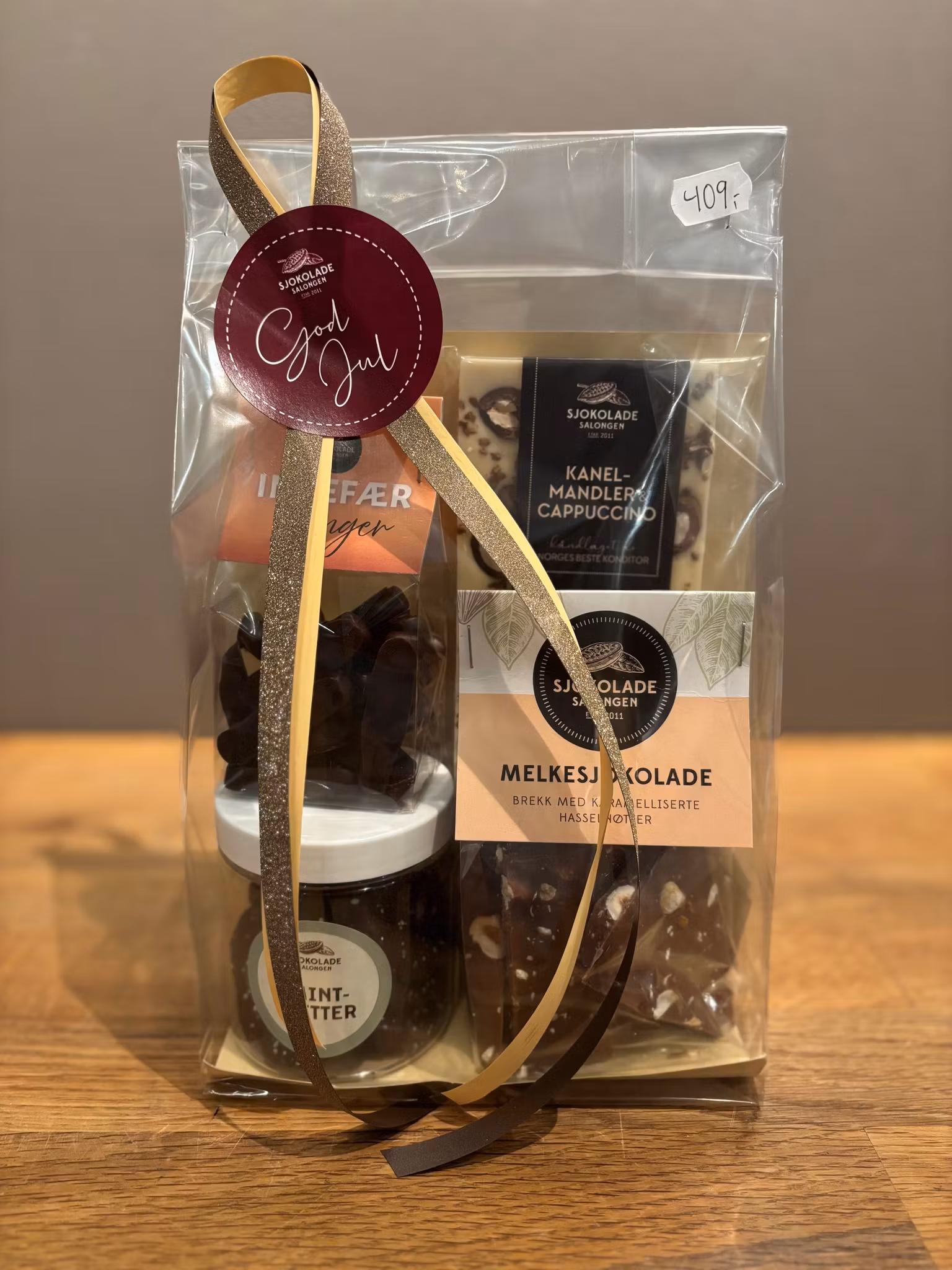 Sjokoladebrekk med hasselnøtter, hvit sjokoladeplate med kanelmandler & cappucinodryss, mintpletter & ingefærstenger