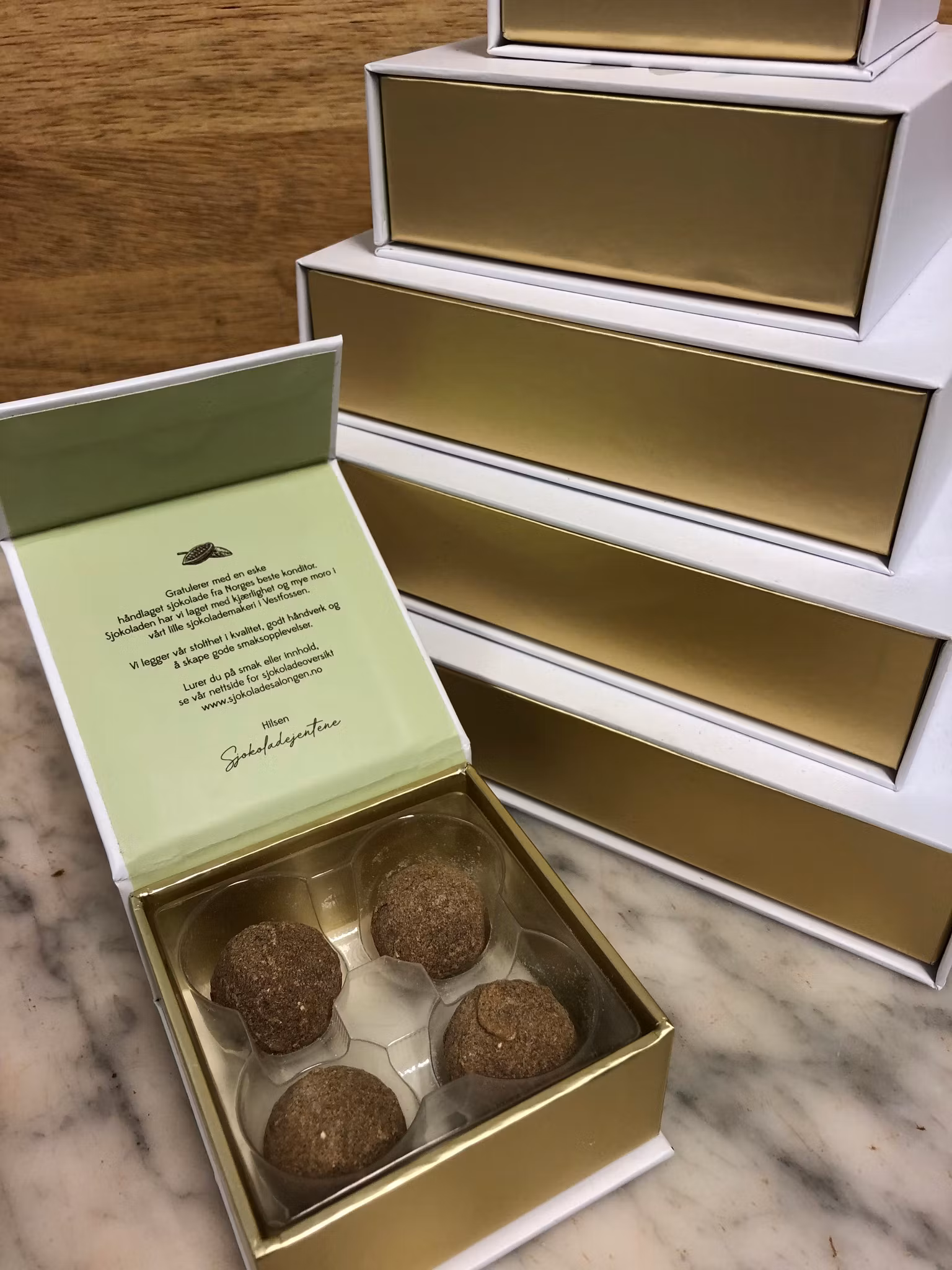 4 håndlagde sjokoladekuler pakket i fin konfekteske.