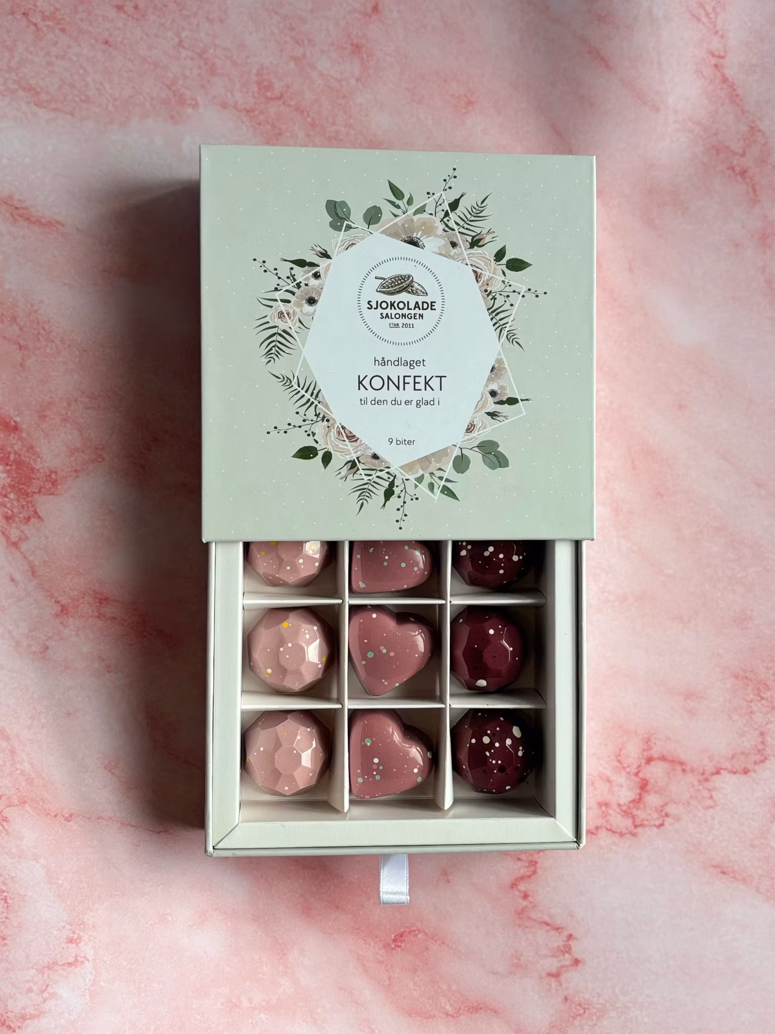 9 støpte, håndlagde konfektbiter pakket i fin konfekteske.