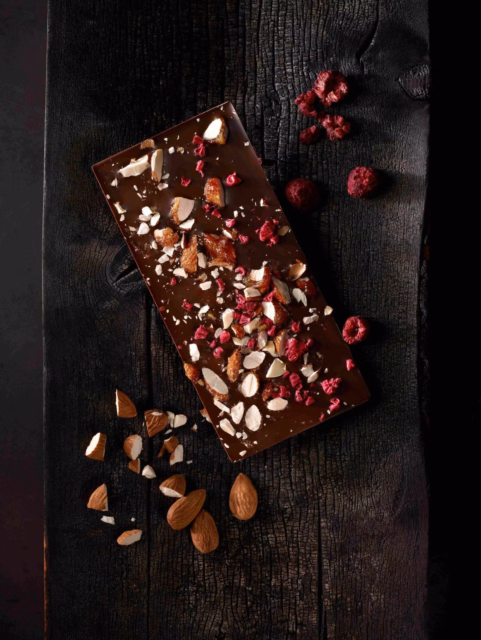 Mørk sjokolade med karamelliserte mandler & bringebær