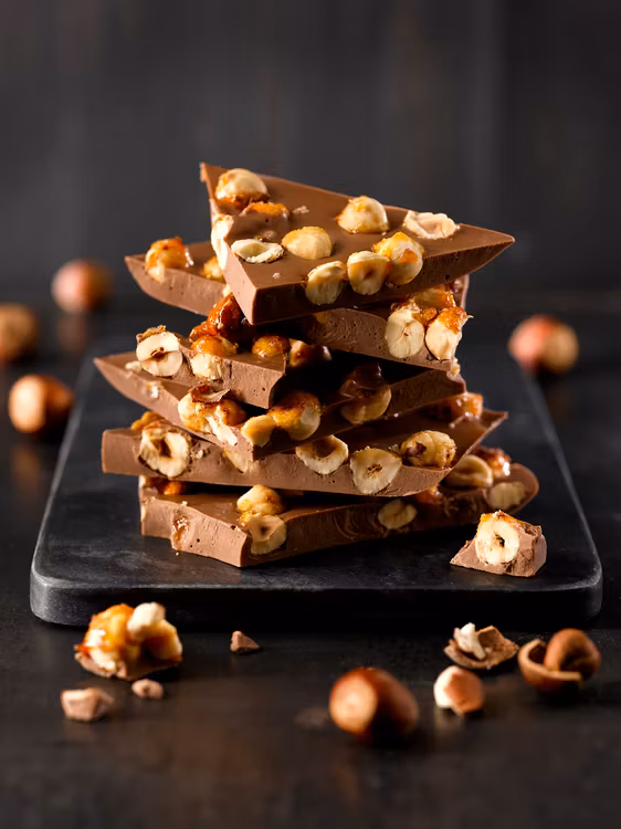 Melkesjokolade med karamelliserte hasselnøtter.